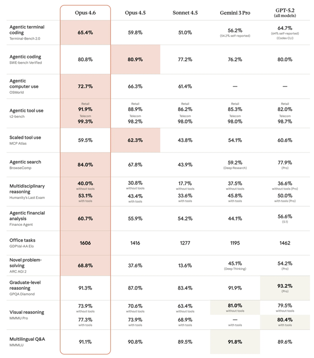 同时在金融分析、计算机使用、工具使用、检索和代理式编程的专项测试中,Opus 4.6也是行业领先的模型。